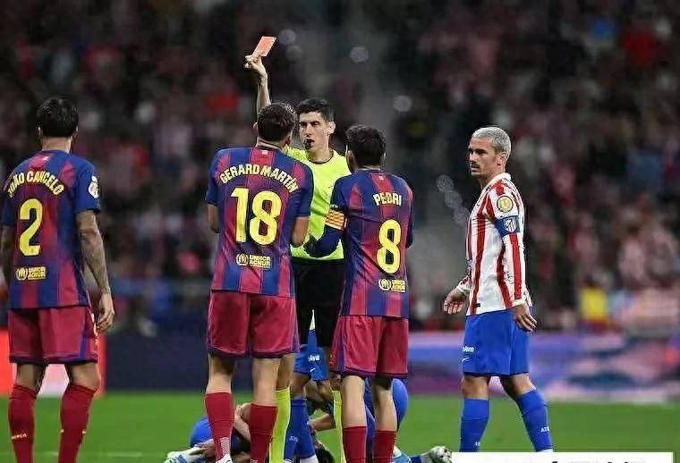第44分钟,诺坎普的喧嚣瞬间凝固。 巴萨年轻中卫库巴西在回追中放倒了形成单刀的马竞前锋小西蒙尼。 主裁判起初掏出了黄牌,但在VAR介入后,他走到场边看了回放。 回到场内,他取消了黄牌,直接亮出红牌。